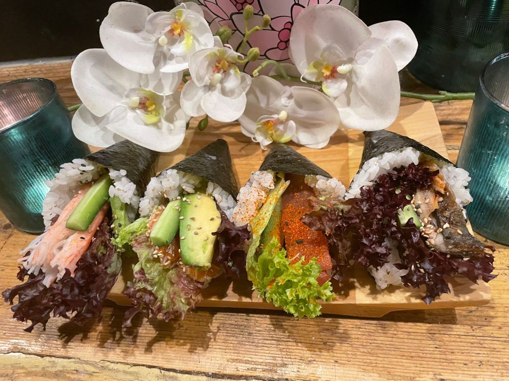 4 nigiri (2 avocado en 2 omelet) - 6 maki (3 komkommer en 3 omelet) - 6 inside out (3 Italian rol en 3 groenterol) 3 gunkan (1 zeewiersalade, 1 sojaboontjes, 1 mais)